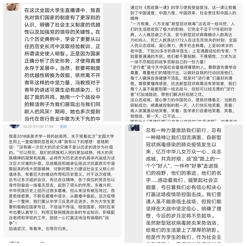 经过周密组织,“全国大学生同上一堂疫情防控思政大课”在广大师生中引发了强烈共鸣。课后,BETVlCTOR手机登录全体思政课教师组织学生在各个教学班的微信里就直播内容进行了热烈讨论。学生们纷纷表示,此次讲授内容丰富,形式新颖,意义重大。地理与环境学院陈佳卉同学说:“冯秀军老师讲得太棒了,字字句句直击心灵,为老师打call。爱国是最大的责任担当,作为中国青年的我们要承担起时代责任,做到胸有大志、心有大我、肩有大任、行有大德。” 。机械工程学院郑阳同学说,“经过一堂思政课的教导,我明白了许多,这不仅仅是一堂课,更是对我们人生的引领。”电子电气工程学院秦开颜同学说:“没有人是天生的英雄,当病毒肆虐时,总有人挺身而出,守四方清明无恙,保人民安定祥和。站在抗疫一线的白衣天使们何尝不知此行的危险,但是他们心向往之,行必所至。乌云遮不住升起的太阳,疫情挡不住春天的来临。团结、勇敢、自信的中华儿女定能打赢这场防疫阻击战!”教育学院刘梓香同学说:“疫情防控这堂思政大课让我感动,全国各族人民众志成城、同舟共济,体现了中华民族的强大力量和中国特色社会主义制度的显著优势。我们要珍惜韶华,发奋学习,做有理想、有本领、有担当的新时代青年,为服务人民、报效祖国积蓄力量。”
