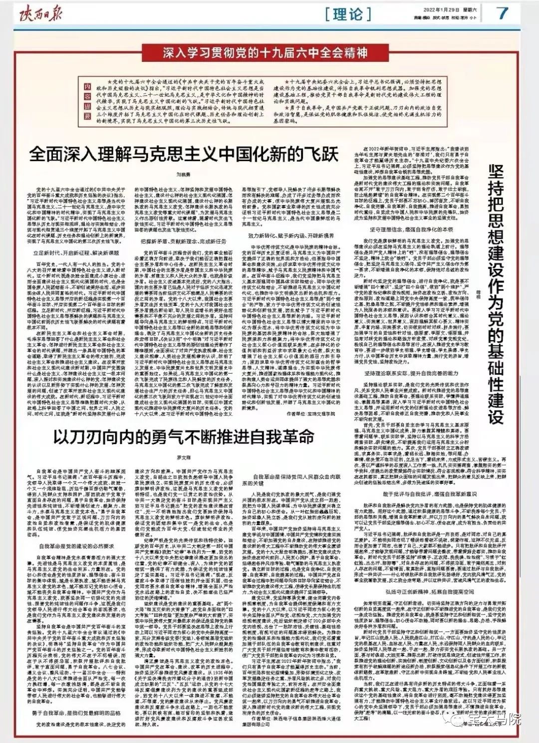 1月29日,《陕西日报》第7版(理论版)刊发BETVLCTOR伟德BETVlCTOR手机登录院长、陕西省重点中国特色社会主义理论体系研究中心(宝鸡基地)主任刘晓勇理论文章《全面深入理解马克思主义中国化新的飞跃》。
