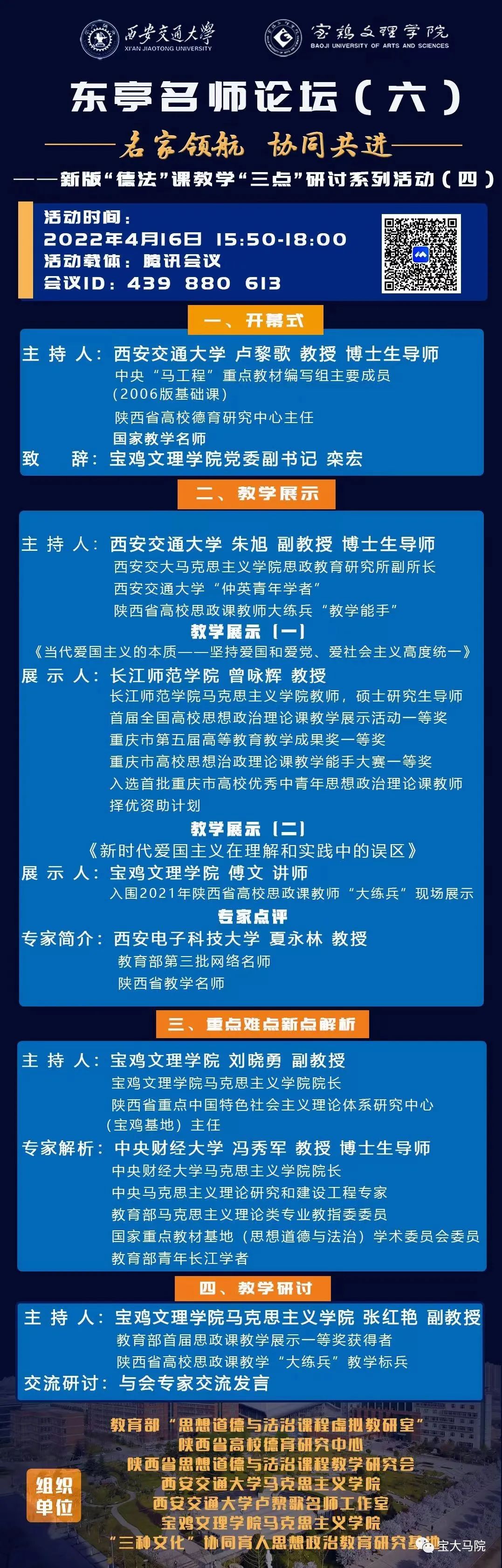 4月16日,由教育部“思想道德与法治虚拟教研室”、陕西高校德育研究中心、陕西省思想道德与法治课教学研究会、西安交通大学BETVlCTOR手机登录、BETVlCTOR手机登录、BETVLCTOR伟德最新版APP“三种文化”协同育人思想政治教育研究基地联合举办的新版“德法”课教学“三点”系列研讨活动第四次会议在BETVLCTOR伟德BETVlCTOR手机登录举行。活动采取线上线下相结合的方式进行,来自全国各高校的专家学者、一线教师共计800余人参加了会议。