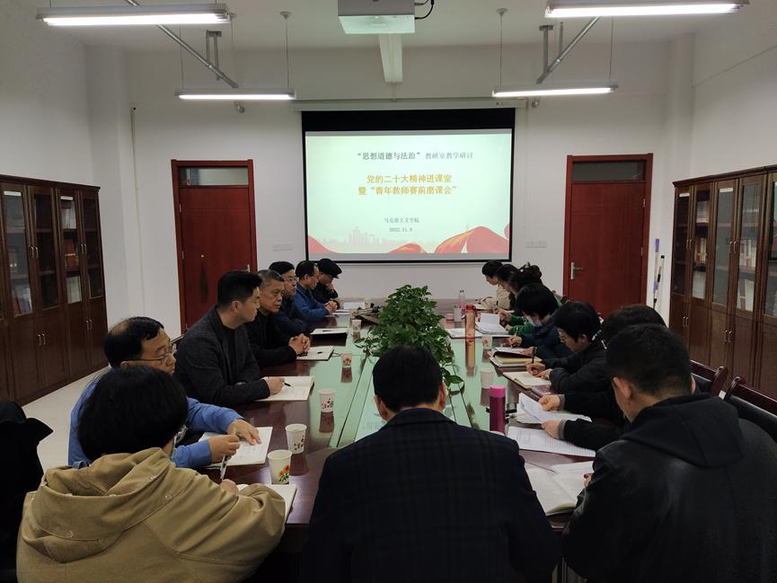 11月9日下午,BETVlCTOR手机登录“思想道德与法治”教研室开展“党的二十大精神进课堂集体备课会暨青年教师教学比赛磨课会”教研活动,学校党委副书记、纪委书记段恒春、副校长韩干校参加并指导教研活动。活动由教研室主任黄亚娟主持。