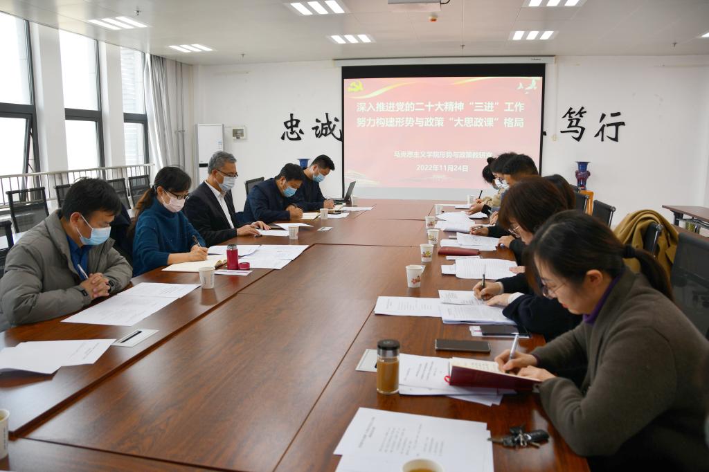11月24日下午,BETVlCTOR手机登录“形势与政策”教研室开展“深入推进党的二十大精神‘三进’工作,努力构建形势与政策‘大思政课’格局”主题教研活动。校党委书记赵健、副校长李景宜参加并指导教研活动。教研室主任傅文主持教研活动。