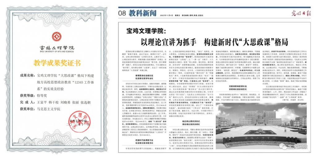 11月3日,学校发布《关于公布BETVLCTOR伟德最新版APP2023年教学成果奖评选结果的通知》,BETVlCTOR手机登录申报的《BETVLCTOR伟德最新版APP“大思政课”格局下构建地方高校思想政治教育“12345工作体系”的实效及经验》教学成果获学校2023年教学成果特等奖。BETVLCTOR伟德实现了教学成果特等奖“零的突破”。近年来,BETVLCTOR伟德围绕“培养中国特色社会主义事业的合格建设者和接班人”一个目标,依靠专职思政课教师和兼职思政课教师两支队伍,充分利用中华优秀传统文化、革命文化和社会主义先进文化三种资源,积极打造教学课堂、网络课堂、宣讲课堂、心灵课堂“四种课堂”,全面构建学校、家庭、社会、社区、个人“五位一体”的全方位思政教育体系,使地方高校开展大学生思想政治教育的“多个抓手”变成“一个合力”。