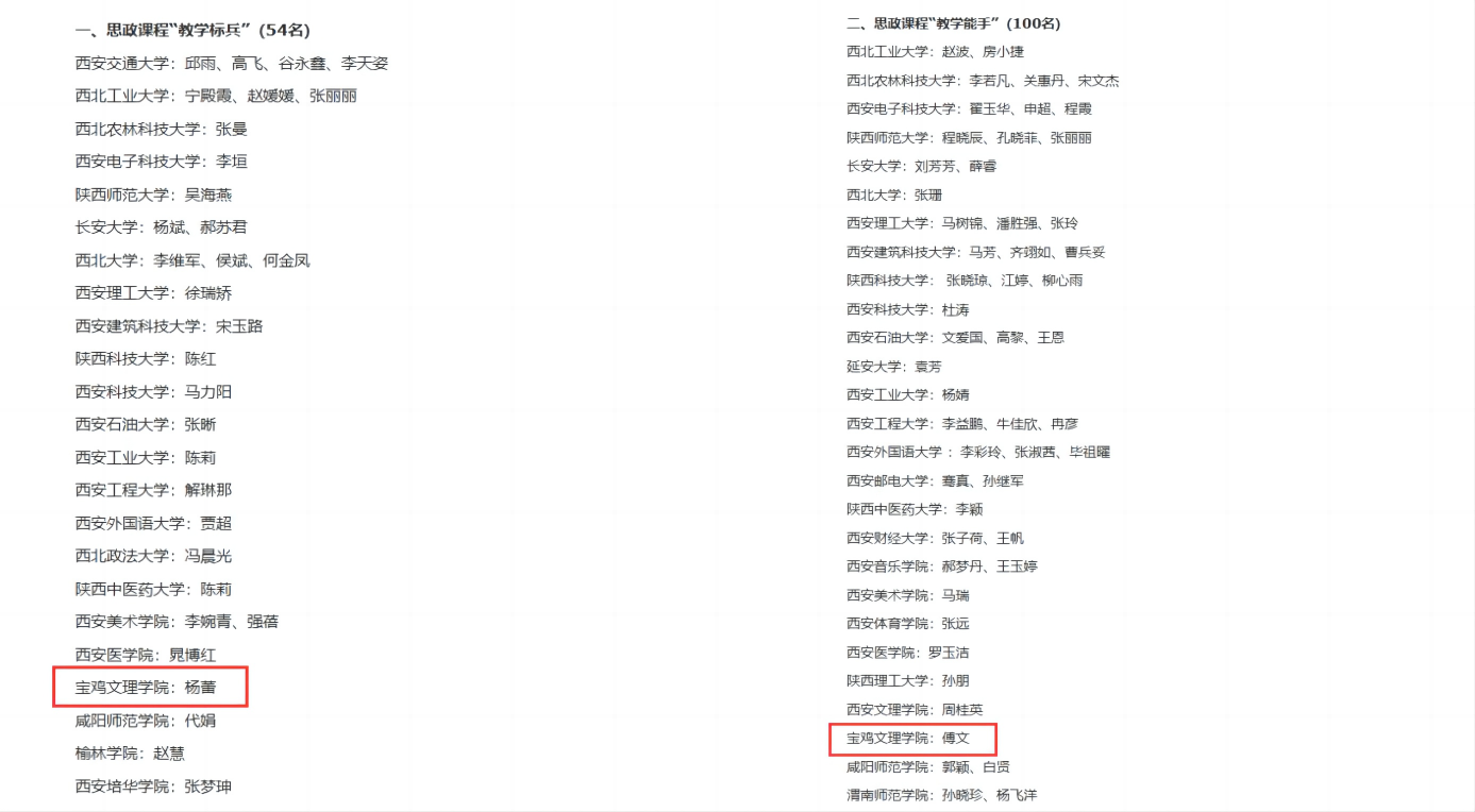 12月22日,省委教育工委发布了《关于公布2023年度陕西高校思政课程课程思政教师“大练兵”省级展示活动结果的公告》,杨蕾获“教学标兵”称号,傅文获“教学能手”称号。