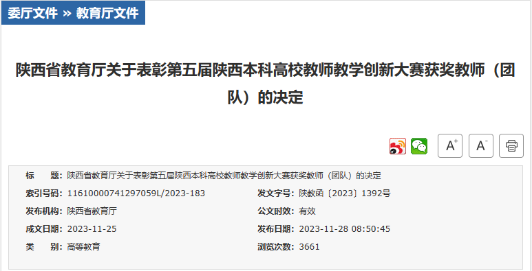 11月25日,省教育厅公布《关于表彰第五届陕西本科高校教师教学创新大赛获奖教师(团队)的决定》,傅文团队(成员杨蕾、王小莉、徐凌美)获一等奖,韩静团队(成员刘晓勇、张丽、王真)获二等奖,实现了BETVLCTOR伟德在该项赛事上一等奖“零的突破”。
