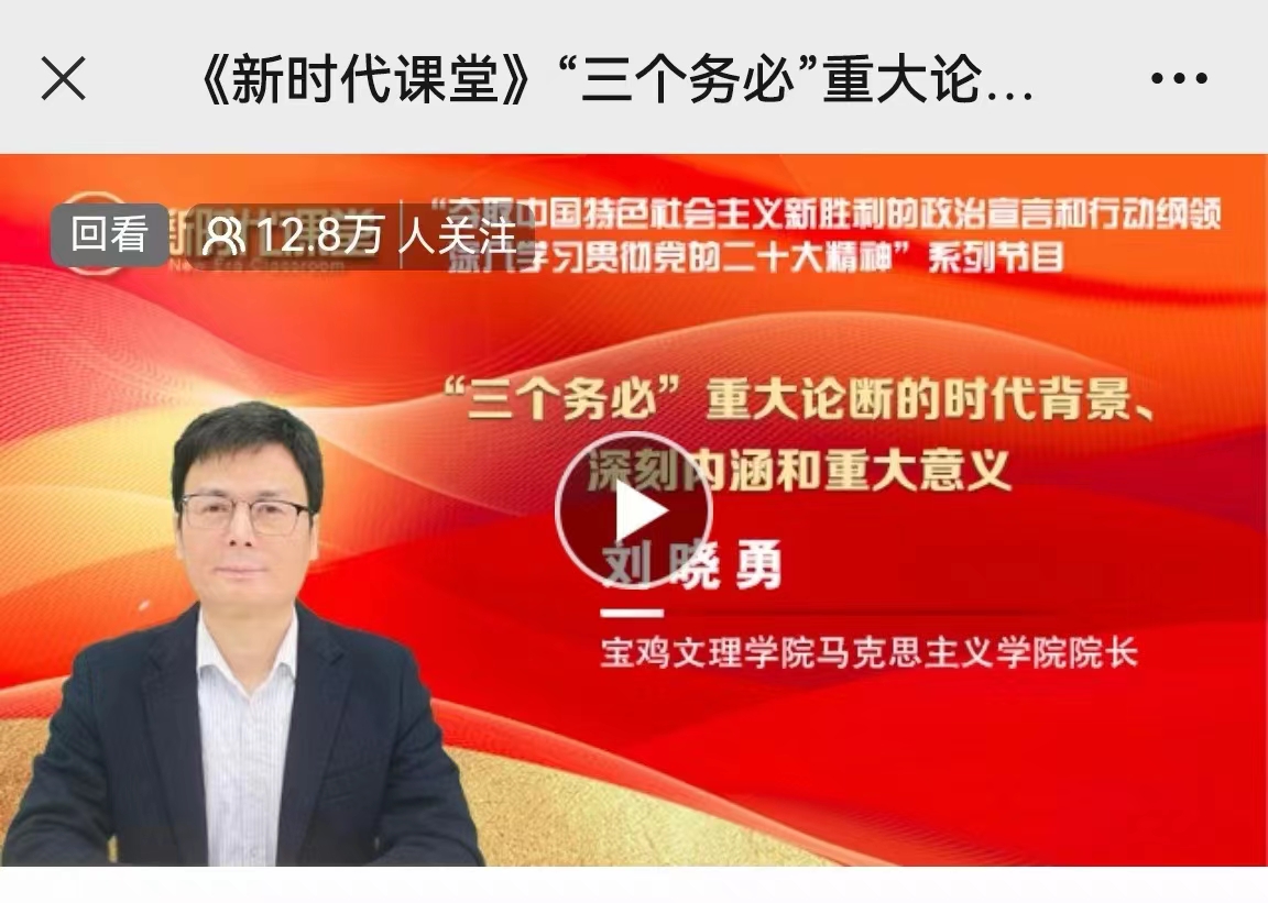 7月20日,刘晓勇受邀做客陕西电视台《新时代课堂》,以《“三个务必”重大论断的时代背景、深刻内涵和重大意义》为题,解读马克思主义中国化不断发展深化的理论成就。节目在“学习强国”等平台播出,12.8万人同步观看。