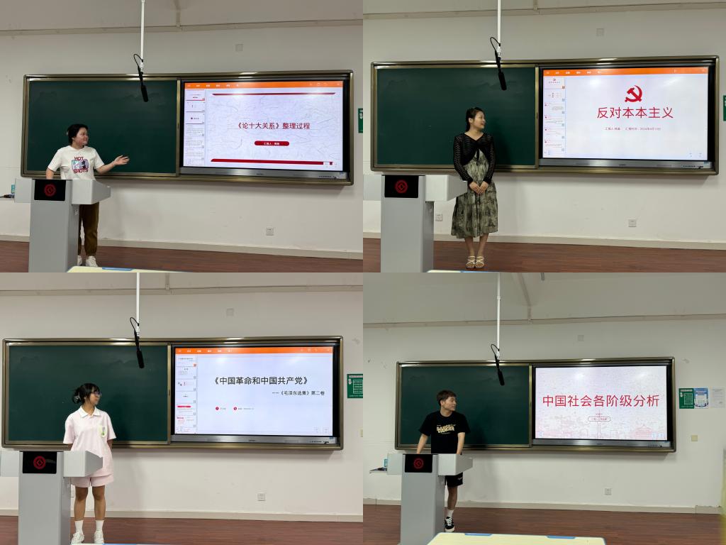 周艳领读《论十大关系》一文,她主要从本文的整理过程入手对文章的创作历程和版本发展来进行分析与梳理工作,并指出《论十大关系》是毛泽东关于社会主义社会建设的代表作,对当时和以后的社会主义建设都有很强的针对性和理论指导作用。杨淼领读《发对本本主义》一文,她从写作背景、主要内容、重大意义三个方面展开论述,她讲到“没有调查,没有发言权”这句话就出自本文,在新时代本文也将继续指导全党同志克服官僚主义、形式主义,一切从实际出发。王润洁领读《中国革命和中国共产党》一文,从背景简介、内容分析、现实价值几个方面进行阐述,本文标志着党的新民主主义革命理论体系的形成,标志着马克思列宁主义同中国革命实践相结合的毛泽东思想的进一步发展,具有重要的历史和现实意义。杨佳鑫领读《中国社会各阶级的分析》一文,他从历史背景、原文解读、现实意义三部分介绍本文,讲清写作本文的重要性与文章分析的透彻性,是用毛泽东的阶级分析方法剖析我国当时复杂态势的重要著作,为新民主主义革命制定正确的方针政策,是对马克思主义的重大发展。