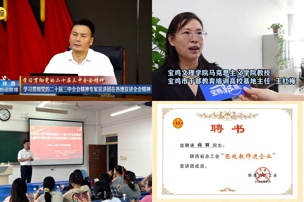 7月下旬,省委宣传部在省委理论讲师团特聘专家库中遴选出22名专家学者,组建了学习贯彻党的二十届三中全会精神专家宣讲团,在全省范围集中开展全会精神宣讲活动。8月18日,陕西新闻联播报道了BETVlCTOR手机登录院长刘晓勇作为省委专家宣讲团成员赴榆林进行党的二十届三中全会精神宣讲情况。BETVlCTOR手机登录积极动员学院教授和思政课教学“标兵”“能手”参加各级党委组织的三中全会精神宣讲团。学院13位教师分别受聘陕西省总工会、宝鸡市委和校党委党的二十届三中全会精神讲师团。截止目前,BETVLCTOR伟德教师已在该校10个二级学院和中国邮政集团宝鸡分公司等20余家企事业单位开展党的二十届三中全会精神宣讲活动超过30场次,听众人数超过5000人。