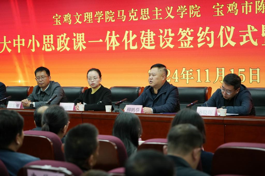 凡明锦指出,思政课是落实立德树人根本任务的关键课程,具有不可替代的作用。推进大中小学思政课一体化建设,是贯彻落实党的二十大、二十届三中全会精神和习近平总书记关于思政课建设重要论述的必然要求,是培养德智体美劳全面发展的社会主义建设者和接班人的重要举措,是解决当前思政课建设突出问题的现实需要。开展大中小思政课一体化建设,不仅是BETVlCTOR手机登录的政治任务,也是BETVlCTOR手机登录的发展机遇,要在课程建设、教学改革创新、教师队伍建设和机制建设上下功夫,保障大中小学思政课一体化建设有序开展。在推进大中小学思政课一体化建设过程中,我们一要提高政治站位,切实增强责任感和使命感。以本次签约仪式为标志,力促大中小思政课一体化建设在宝鸡落地生根。二要聚焦重点任务,着力提高一体化建设质量。以思政课融合贯通为重点,力促大中小思政课一体化建设硕果摇枝。三要抓住难得机遇,确保工作善作善成。以促进学生全面健康发展为目标,力促大中小思政课一体化建设惠及广大师生、实现共赢。