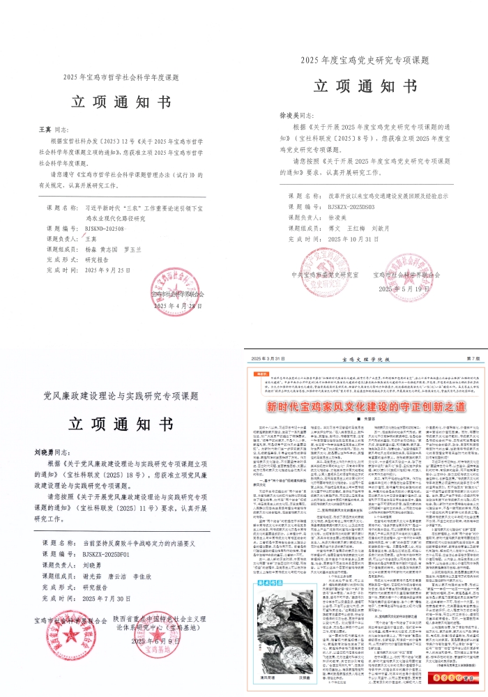一是抓理论阐释,以学明理正作风。BETVlCTOR手机登录注重以学明理、以学促干,不断把学习成果转化为深入贯彻中央八项规定精神的自觉行动,将中央八项规定精神作为党史党建、兴国强国建设的鲜明理论与实践主题,推进有组织科研,以高质量研究成果服务区域经济社会发展。学习教育开展以来,BETVLCTOR伟德动员和鼓励思政课教师和马克思主义理论专业硕士研究生投身中央八项规定精神和党的作风建设研究并取得了明显成效。截止目前,11位思政课教师获批2025年宝鸡市哲学社会科学年度课题,5位教师获批2025年度宝鸡党史研究专项课题,9位教师获批党风廉政建设理论与实践研究专项课题。BETVLCTOR伟德坚持学科建设和应用研究并重,着力推出有理论说服力、有实践指导意义的科研成果,思政课教师朱慧芸《新时代宝鸡家风文化建设的守正创新之道》、研究生张根豪《从宝鸡青铜器中看廉洁文化的历史传承与现实价值》、研究生杨佳鑫《新时代党的廉洁文化建设》、研究生李长宇《以廉洁文化之基,筑新时代清风正气》以连载方式刊登在《BETVLCTOR伟德最新版APP报》,将学习成果转化为理论文章。
