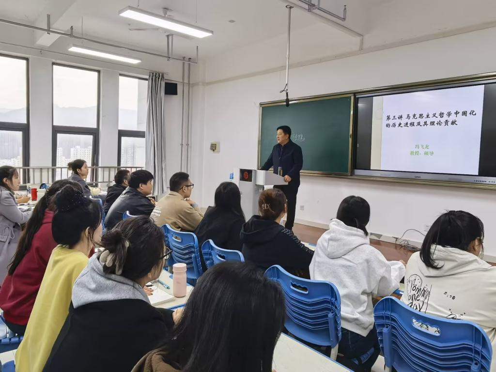 为深入推进习近平新时代中国特色社会主义思想进教材、进课堂、进头脑,更好落实立德树人根本任务,2025年10月31日下午,副校长冯飞龙在高新校区博文楼1506教室以《马克思主义哲学中国化的历史进程及理论贡献》为题为BETVlCTOR手机登录2025级全体研究生讲授思政课。