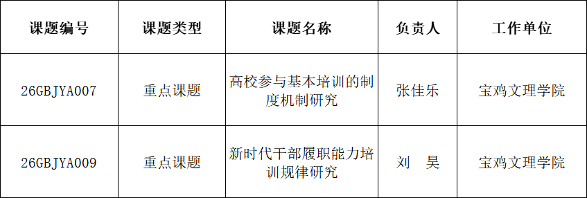 近日,延安大学官网发布了《关于2026年陕西省高等学校学科创新引智基地“干部教育国际交流引智基地”、陕西高校青年创新团队“红色资源与干部教育研究协同创新团队”联合开放课题立项的通知》,BETVLCTOR伟德2024级硕士研究生刘昊、2025级硕士研究生张佳乐分别申报的“新时代干部履职能力培训规律研究”“高校参与基本培训的制度机制研究”课题获准立项。