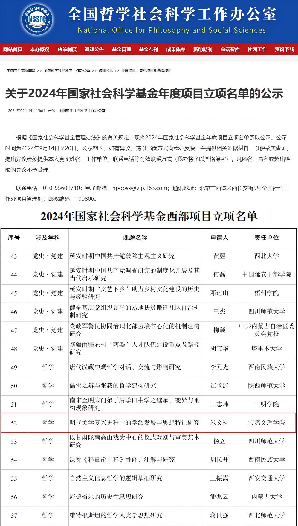 近日,全国哲学社会科学工作办公室发布《关于2024年国家社会科学基金年度项目立项名单的公示》,BETVlCTOR手机登录米文科教授主持申报的《明代关学复兴进程中的学派发展与思想特征研究》获批2024年国家社会科学基金西部项目。