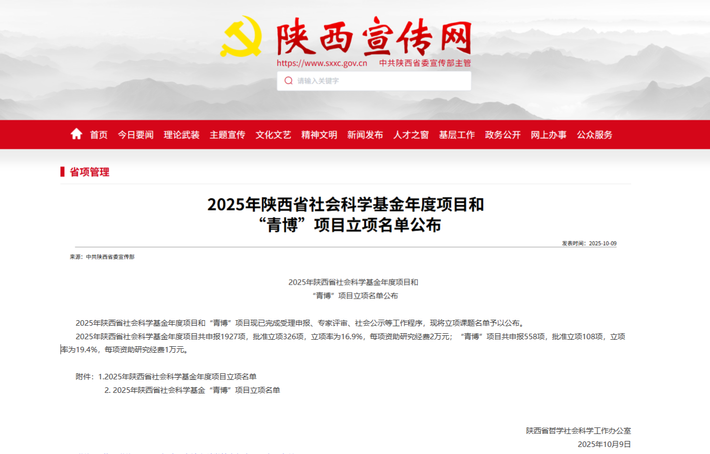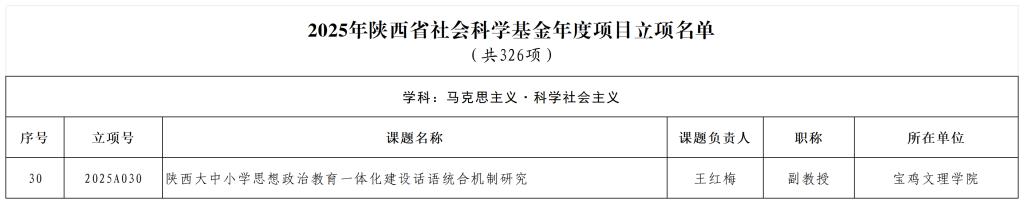 近日,陕西省哲学社会科学工作办公室公布了《2025年陕西省社会科学基金年度项目和“青博”项目立项名单》,BETVLCTOR伟德王红梅副教授申报的课题《陕西大中小学思想政治教育一体化建设话语统合机制研究》获准立项。